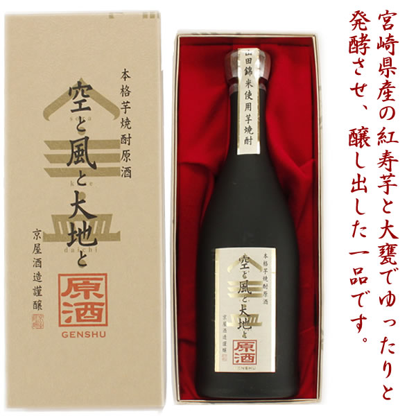 産 地 内 容 量 720ml 度 数 42度 原材料 甘藷(宮崎紅寿芋) 、米麹(山田錦) 梱包形態 化粧箱入 製 造 者 京屋酒造 有限会社2011年モンドセレクションにおいて、 最高金賞を受賞!! 「空と風と大地と 【原酒】 」とは この焼酎は、酒造好適米「山田錦」を丹念に磨き麹米として仕立てました。